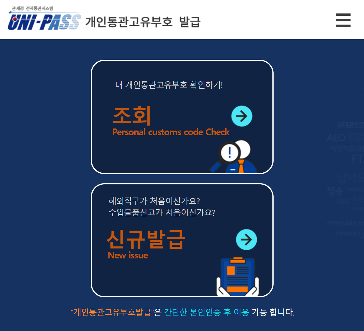 "개인통관고유부호발급"은 간단한 본인인증 후 이용 가능 합니다.