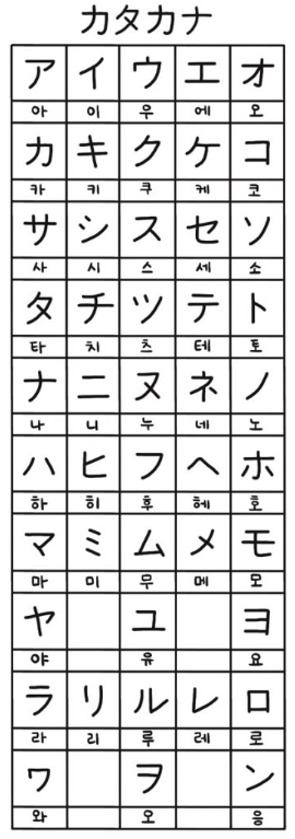 가타카나는 히라가나와 비슷하게 46개의 글자로 이루어져 있으며, 각 글자는 히라가나와 모양이 다르지만 발음은 같습니다.