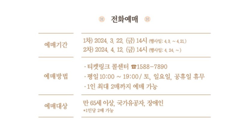 - 예매 대상: 만 65세 이상, 장애인, 국가유공자