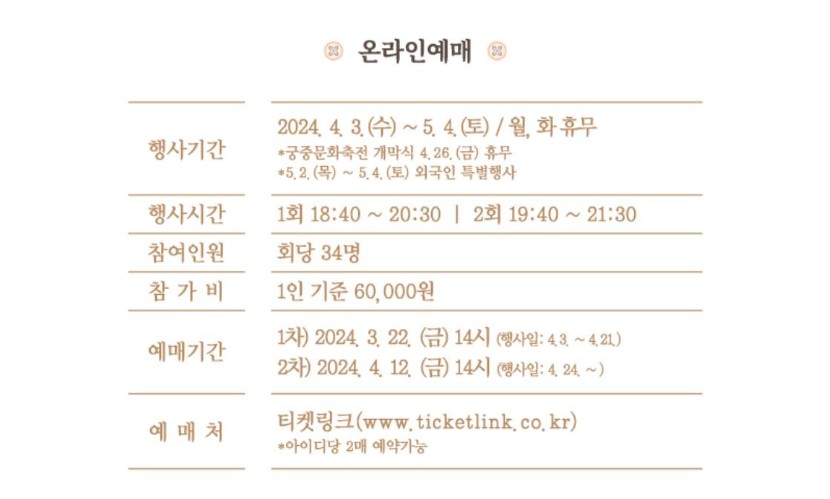 - 예매처: 티켓링크 (아이디당 2매 예약 가능)